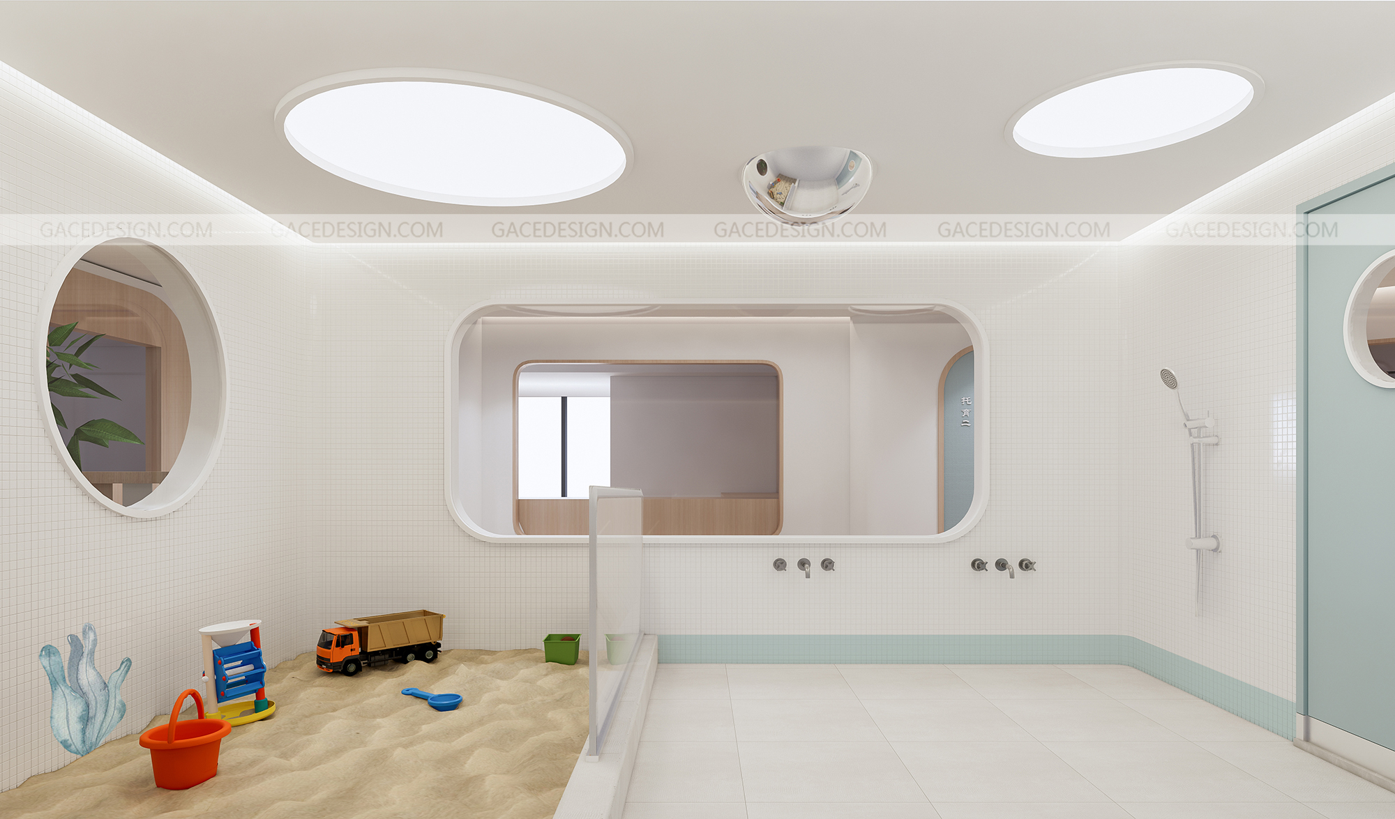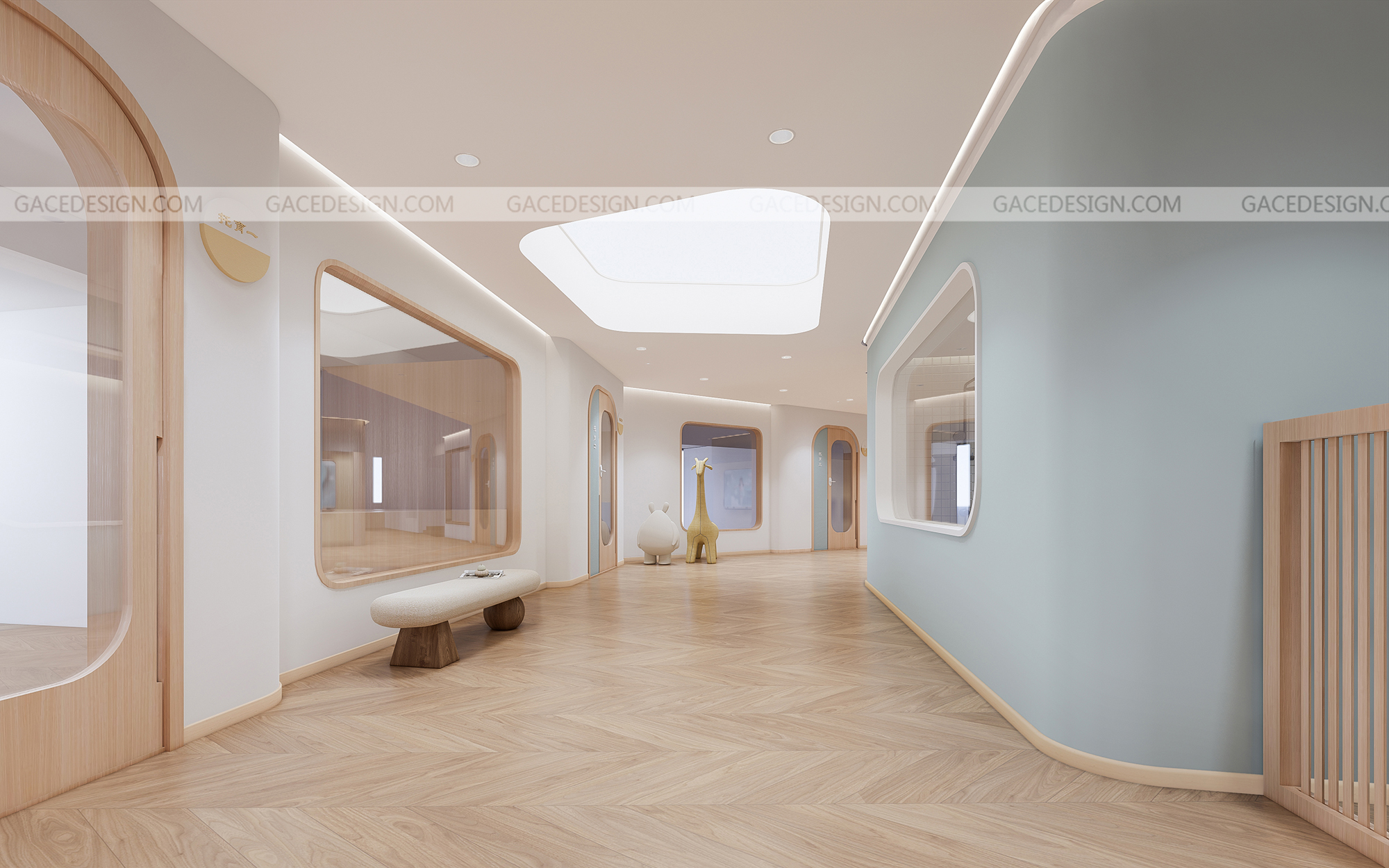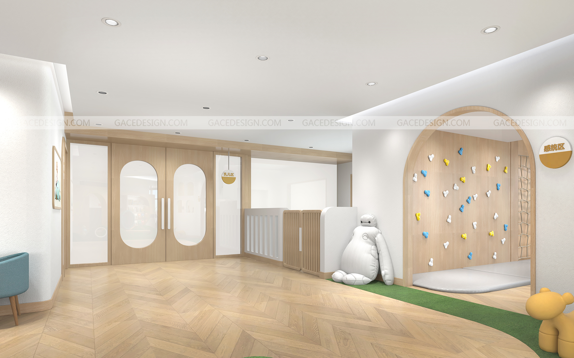 設(shè)計(jì)思路:通過(guò)有溫度感的設(shè)計(jì),干凈的空間,但又能夠讓使用者有舒服的體驗(yàn),設(shè)計(jì)不是堆砌造型,應(yīng)該讓使用者在里面待的狀態(tài)可以很放心,溫暖。通過(guò)空間里面的大小細(xì)節(jié),材質(zhì),燈光,人與人之間的眼神和交流而感到幸福。通過(guò)具備挑戰(zhàn)性的區(qū)域讓孩子們有各種情感上的變化。而且我們?cè)谑覂?nèi)設(shè)計(jì)了一個(gè)微縮園林,希望孩子可以與自然環(huán)境緊密相連。