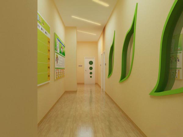 地面至1.2米處也可鑲貼瓷片,一是方便清潔,二可以增添幼兒園特色的氛圍,還可以掛上一些可供幼兒寫畫的小黑板,便于幼兒表現(xiàn)自我、抒發(fā)內(nèi)心感受。裝飾墻面的材料顏色要淡雅、明快,要考慮環(huán)境的功能性以及采光情況??捎觅N或刷的方法,裝飾出大塊的抽象圖案。幼兒園設(shè)計(jì)整體色彩既要注意統(tǒng)一,又要強(qiáng)調(diào)變化,體現(xiàn)幼兒園特點(diǎn)。