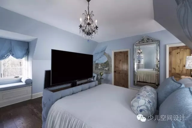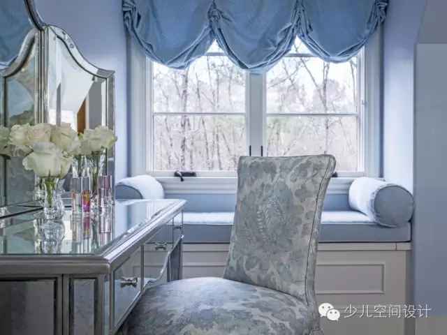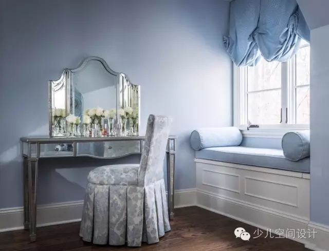 柔和的板藍(lán)色和銀色用來打造像公主一樣的宮殿。設(shè)計(jì)師給她設(shè)計(jì)一個(gè)特別舒適的窗口角落,也方便閱讀。從流動(dòng)的瀑布式窗口處理的啟示進(jìn)行概念設(shè)計(jì)的手繪壁畫。在床上,還定制了床罩和枕頭等匹配裝飾的家居用品。
