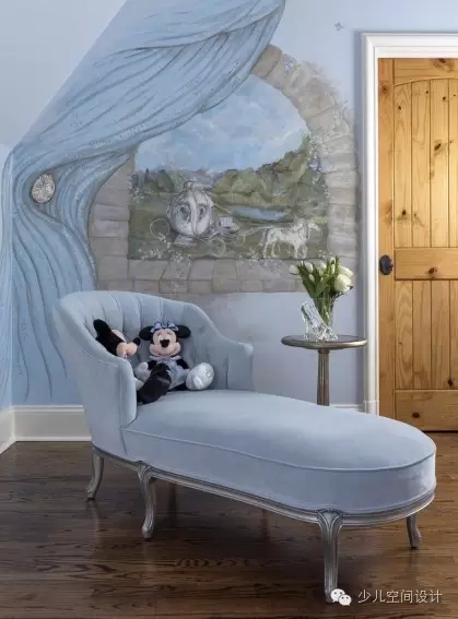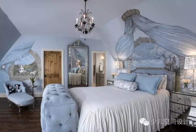 設(shè)計(jì)的壁畫,這與童話的主題,品味相輔相成,時(shí)尚典雅,讓人產(chǎn)生幻想的空間,從而解決了房間里面天花板和墻壁的問題。