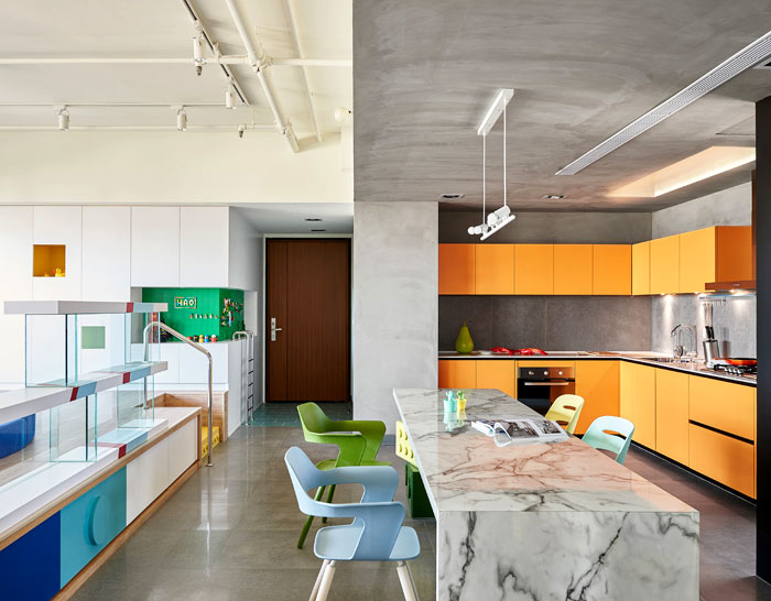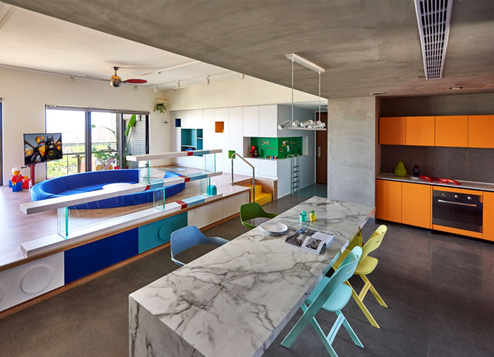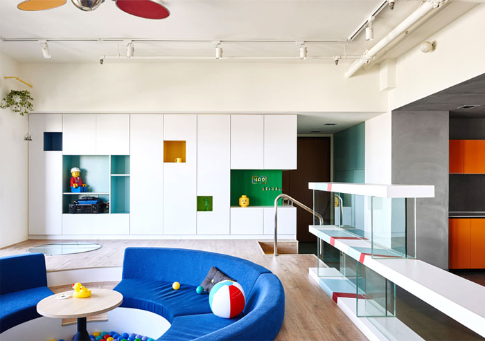 這是位于臺灣高雄的一座公寓,年輕的屋主希望將原先的公寓改造,作為樂高發(fā)燒友,他們希望新的設(shè)計可以融入樂高的元素,不僅滿足了自己的喜好,也讓家中的小朋友有娛樂的空間。