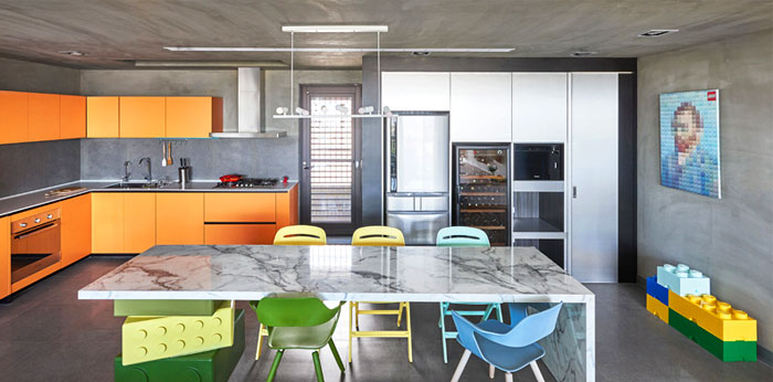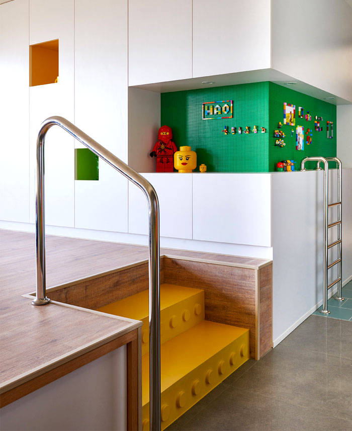 在任一角落似乎都能捕捉到樂高元素,臺階,展示柜,餐桌甚至是墻上的掛畫都被打上了標簽,不同色彩的積木條不僅增添趣味性還讓整個空間變得豐富起來。