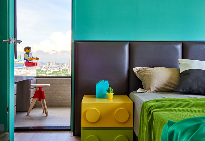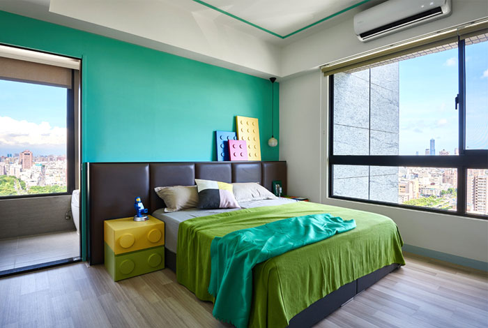 藍色,綠色,黃色,臥室的色彩十分的跳躍,必不可少的樂高元素讓臥室起來就像是玩具中的空間,利用大窗戶帶來的良好采光,降低鮮艷色彩帶來的視覺疲勞,這樣一個充滿童趣的空間也拉近了父母與孩子的距離。