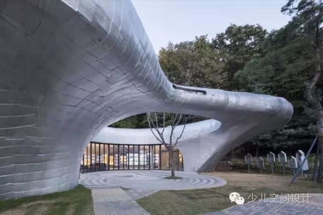 第一棟樓(波浪與鯨魚)試圖表達一種受匹諾曹故事啟發(fā)的空間,大風暴和鯨魚等主題都進行了表現。平面布局采用了曲線,讓人想到子宮內蜷曲的胎兒。平面之后演變成了鯨魚與波浪的結合,最終融為一體。大臺階與小臺階營造的座椅間營造的狹長扭曲空間試圖增強空間的游戲性與冒險感。不幸的是,這里暫時關閉。被建筑圍合起來的不封頂的凹坑狀空間在天氣好時可以作為室內空間的延伸。由于所有的窗戶可以折疊和推到兩側,許多室內的概念與設計都可以被盡可能地實現,但是出于內容與安全考慮只有中間區(qū)域可以安置這樣的內容。