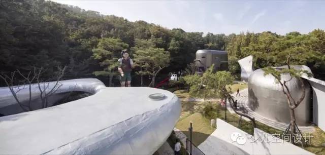 第三棟樓(鼻子噴泉)臨近水池與天空列車。光潔的鼻子是提供了聲音與動感的噴泉,讓這個寧靜的環(huán)境頓時有了生氣。這里的形式呼應了整體的曲線性基調,窗戶也呼應了整天,但是你若是仔細觀察你會發(fā)現摩爾斯電碼。你會嘗試解讀它們,說不定也能猜出一些簡單內容。二層的陽臺向兩側敞開,貫通森林的視線映入眼簾。視線與空間的聯(lián)系恰恰是整棟樓設計的首要考慮因素。在2層的咖啡廳,你不僅可以看到內院,還能坐擁面對其他兩棟樓的極佳視野。