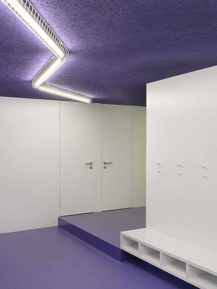 幼兒園的室內也有著各個房間的用途,入口一進去就是衣帽間,然后到教室-資料室-游戲區域和多功能房間。這些依次布局的房間升起于一小段臺階之上。沿著臺階可以一直到達頂層的辦公室。辦公室體量同時覆蓋了位于其下方的入口。繼續沿著臺階往下可以返回入口,這樣完成了整個循環路線。
