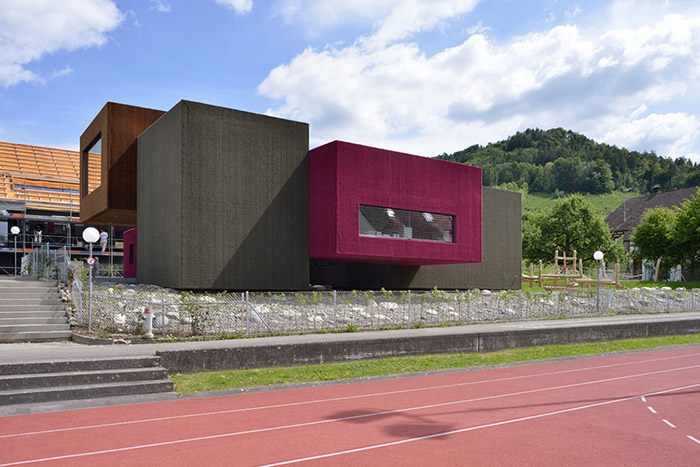 遙遠的瑞士在鄉村一所小學的附近坐落著一座風格獨特的幼兒園,遠遠看去就像是用幾個大箱子堆積起來的一樣,其表面種著有,草黃色、紅色和橄欖綠三種顏色的人工草坪形成了獨特的立面,使得幼兒園和鄉村中心的環境更加的和諧,相比冰冷的墻面柔軟的草坪墻壁更加適合兒童。