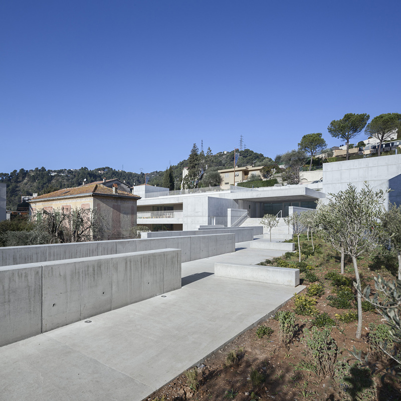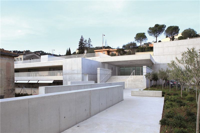 在法國的一家托兒中心名為La Trintite兒童日托中心,這間托兒中心的位置非常有趣,是在公墓和一座購物中心中間的一個花園深處,建筑在場地中的植入,連通周邊環(huán)境,為整個小鎮(zhèn)創(chuàng)造了一個新的物理連接——形成一個連接上部和下部道路的公共通道。受到經(jīng)濟要素的現(xiàn)實,我們限制了挖掘量,因此將停車場放置在屋頂上,這樣地面空間也可以被塑造成為新的公共空間。兩層樓底板挑出了3米的寬度,以保護操場不受到太陽的直曬。這些水平層面要素的設計平衡了結構性的垂直框架,并且容納了日托中心的所有功能要素需求。