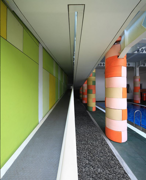 這個建筑的設(shè)計處處為孩子們的安全著想。園長的辦公室專門設(shè)置在一樓,臨近操場和游泳池,這樣可以方便園長監(jiān)控孩子們活動時的安全。操場的地面采用了1.5厘米厚的橡膠材質(zhì)做地板,游泳池被欄桿圍了起來,以防止孩子們發(fā)生安全事故。(幼兒園室內(nèi)設(shè)計)