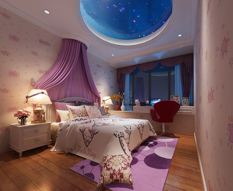 第二公主風:每個女孩子都有著一個公主夢,一個大大的窗口,室內有著一張柔軟舒適的大床,在小的時候可以在室內放置一些卡通風格的公仔長大之后可以換成簡約大氣的風格,而室內以粉色裝飾四周加上天花板上裝飾這一個“星空”對任何一個女孩子來說都有著一種致命的吸引力。(幼兒園設計