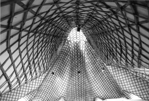 在社區(qū)中心的幼兒園是以一個正方形的網(wǎng)格作為模數(shù)基礎(chǔ),在中央隆起一個三維褶皺的建筑表皮,看上去就像是在地上鋪上一塊巨型的手帕然后抓起來的感覺,褶皺的骨骼部分是由綠色環(huán)保的竹子編制而成,采用竹子編織形成一個竹子網(wǎng)格曲面有著巨大的空間,在竹子外部在增加上保溫層最外層則是用鋼筋混凝土作為整個建筑的“外衣”,整個建筑在園方看過去就想是隨風(fēng)飄動的少女裙擺十分的引人注目。