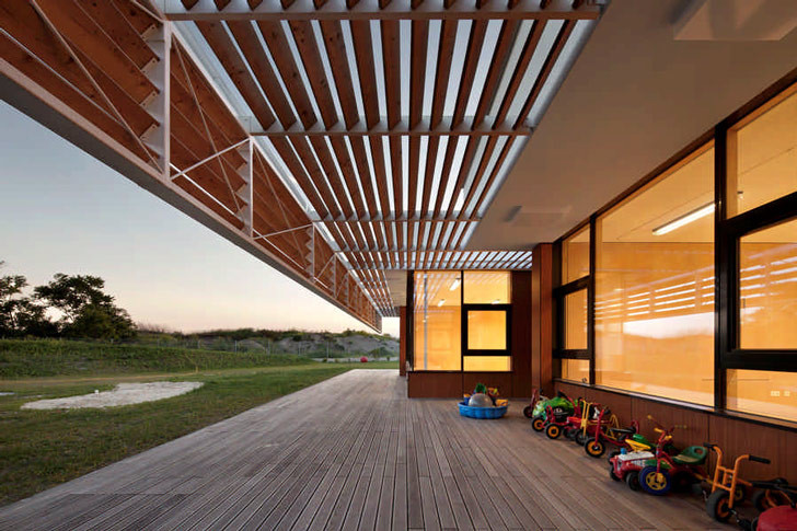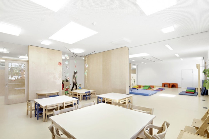 屋頂?shù)脑O(shè)計和開放活動室形成一個新的介于內(nèi)部與外部之間的空間。通過在南北方向的單位位移,在活動室之間形成了視覺連接效果。這個專門為幼兒園設(shè)計的活動室完全可以融入教學(xué)工作中。