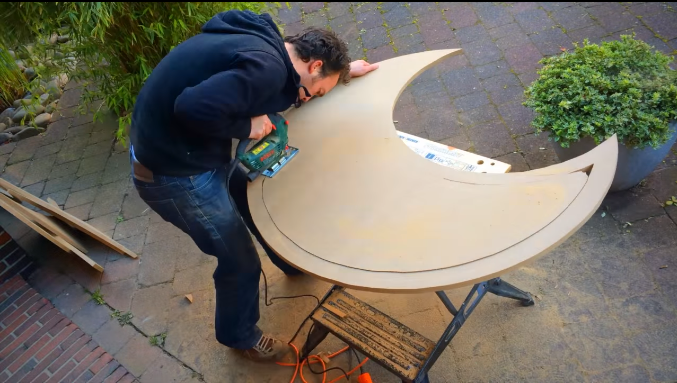 于是這位父親在他休假的時候準備好了木板等材料,規劃出形狀之后就用工具開始切割,就是先裁出一個月亮形的半圓,但是為了結構穩定,沒有徹底切成月亮的形狀。(幼兒園設計)
