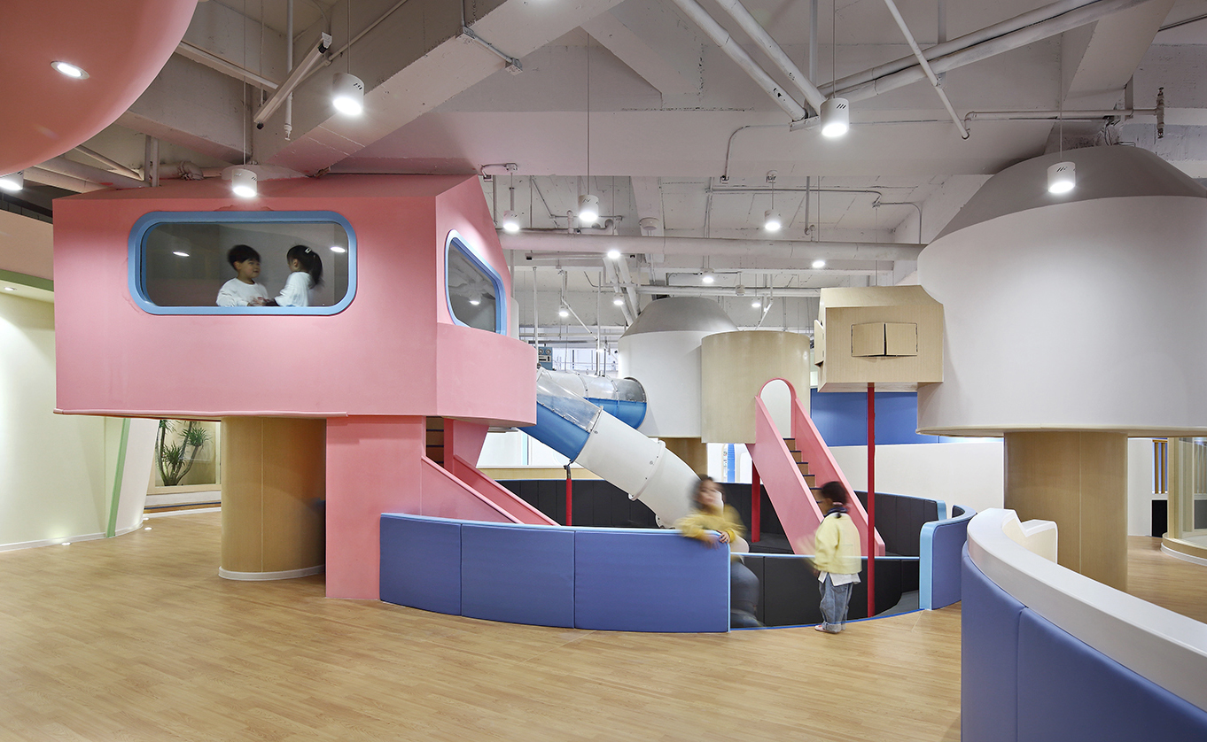 游戲是孩子的活力之源,也是孩子通往世界的途徑。設計師將游樂區布局在室內的中心位置,讓孩子的歡聲笑語激活整座“城”。孩子們會帶著好奇和期待爬上梯子,穿過可愛的小木屋,在管道中匍匐前進,然后“咻”地一下滑入下沉的球池,在不斷變化動作和愉悅的體驗中獲得身心的鍛煉和能力的發展。