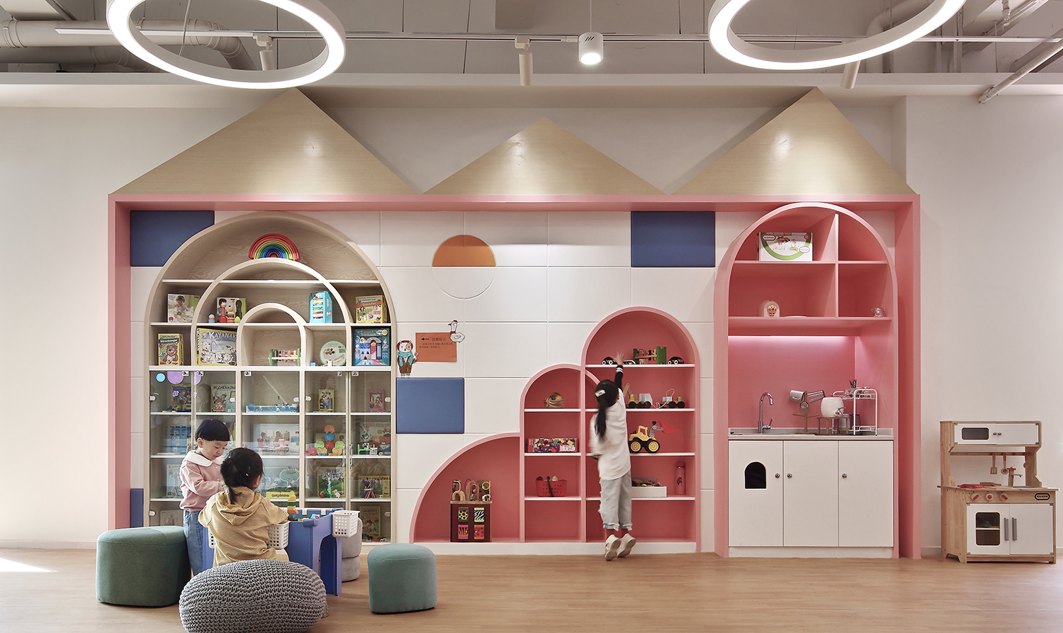 以“城堡”的概念設計桌游區,有趣的柜子收納好玩的玩具,吸引孩子的注意力,引導孩子游戲,讓家長能暫時抽身放心地到近鄰休息或者商談合作事宜。