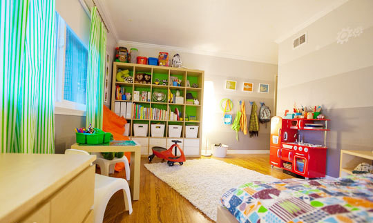 簡約的設計,靠墻的收納柜和一張簡單的書桌,采用兒童適用光源,清新明亮。中間鋪上一張舒適的地毯,方便孩子玩耍。