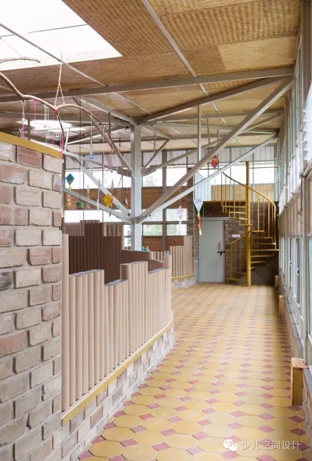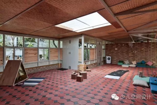 建筑包含4間教室,中心廣場邊上的一間工作室和一間幼兒啟蒙中心的房間與廣場之間有著過度的濾光板。衛(wèi)生間的設(shè)計考慮到了低領(lǐng)人群,小型的尺度不僅適合孩子,還方便監(jiān)護(hù)。衛(wèi)生間暴露的排水管與小便墻的設(shè)置能夠被孩子舒適地使用,并易于維護(hù)。