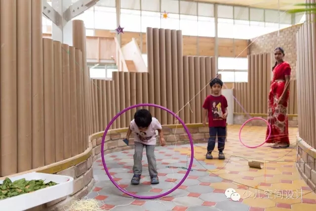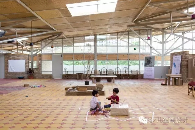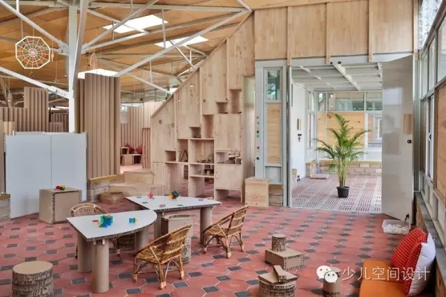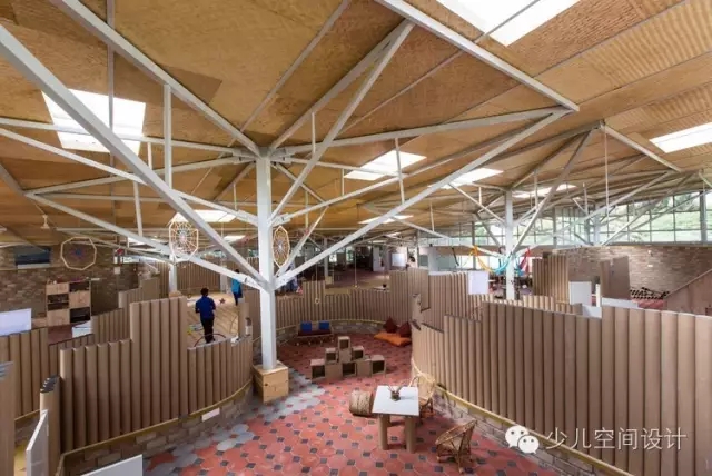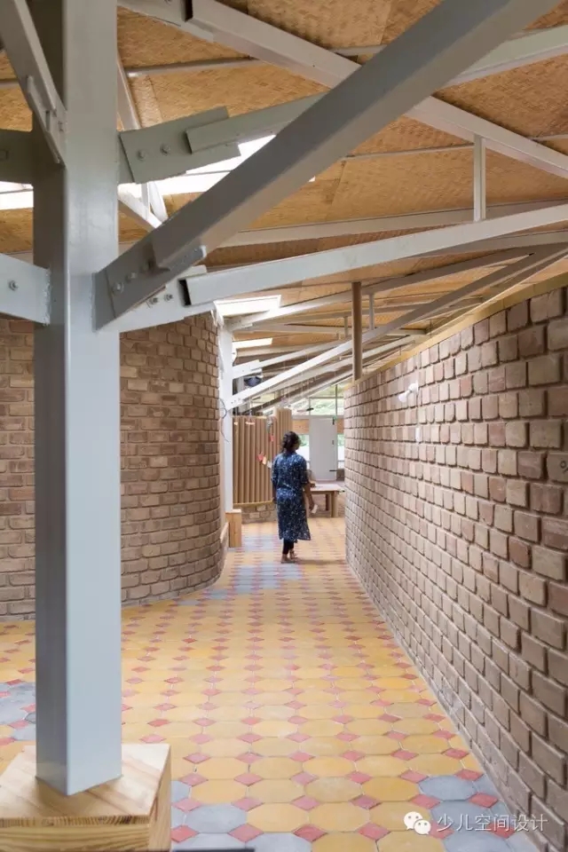 通過滲透性的室內(nèi)設(shè)計,鼓勵了孩子們的探索學(xué)習(xí)——不同高度的墻體圍合了懸挑的教室和公共空間,其上是穿孔的天窗。屋頂收到8根柱子的支撐,每一個形式都是樹枝分叉。這個樹的形式,在形成結(jié)構(gòu)元素的同時,讓屋頂?shù)母叨饶軌蚋鼮楹⒆觽兯兄!皹洹毕碌目臻g同時重新詮釋了學(xué)習(xí)的區(qū)域,這樣的場景在郊外隨處可見。