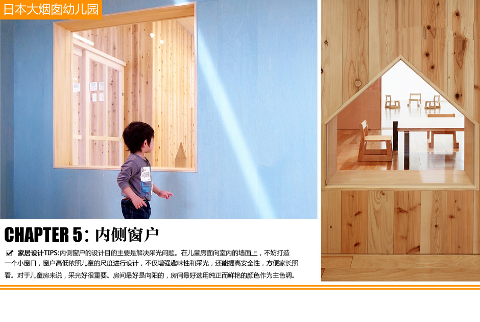 5、這間木制幼兒園的內部有各種形狀的門窗,連通各個空間。孩子們能感覺到從天花、門窗進入的自然光線的變化,甚至可以追逐他們并一同玩耍,讓孩子在日常生活以及活動中享受光的禮物。合適且充足的照明,能讓房間溫暖、有安全感,有助于消除孩子獨處時的恐懼感。