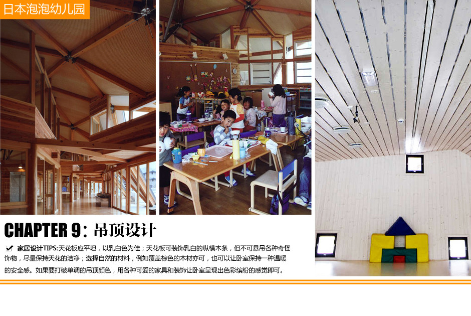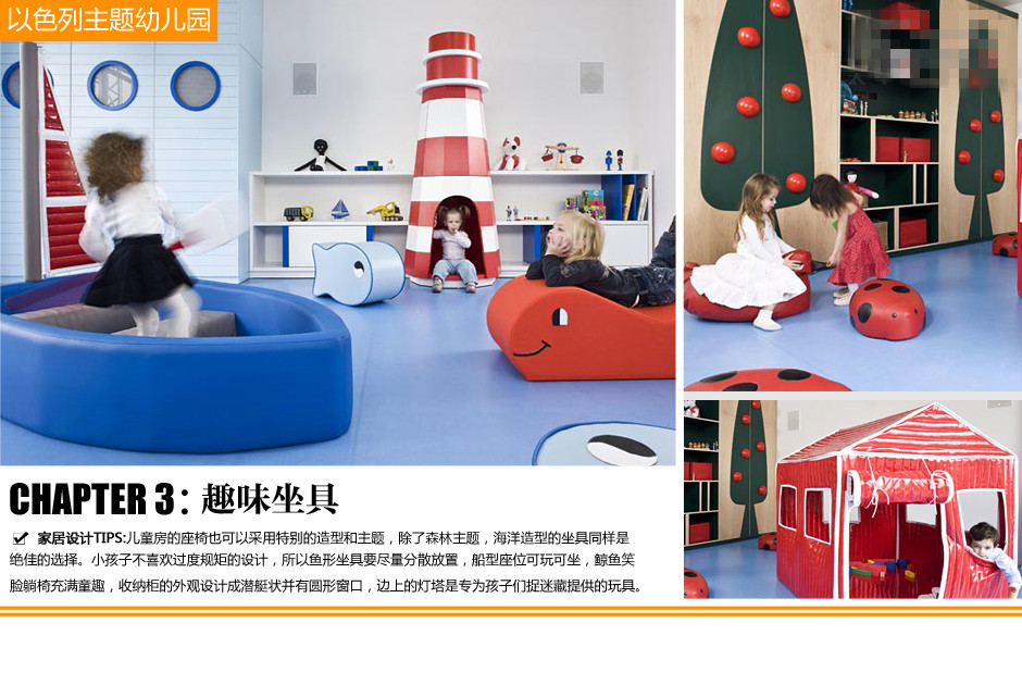 3、這是幼兒園的其中一間教室,低矮的花型座椅散亂分布在教室四處,立體紅蘋果懸掛在樹形的模型上,黑板上懸掛著松樹圖案的浮雕。微型帳篷安放在教室的中心區域,里面填滿了紅白兩色的乙烯基塑料填充物,悅目的色彩給童年增添了不少生動的記憶。
