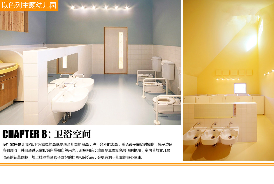 8、這間幼兒園是單層的,突出的天窗讓幼兒園有挑高的天花板。幼兒園有一間衛浴間,這里小巧的用具都是為孩子度身定做的,位置低矮方便孩子的使用。要避免在衛浴間擺放玻璃等易碎物品,近地面的電源插座要隱蔽好,防止造成小孩子不小心觸電。