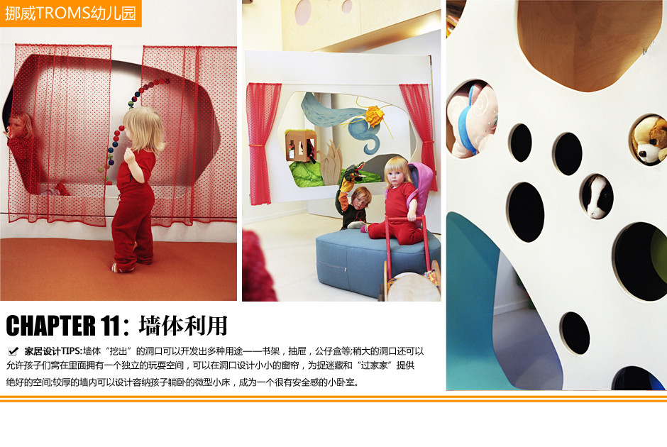 11、墻是這所幼兒園空間的核心設計元素。一般意義上,墻體只承擔分隔空間和隔音的作用,但這里被賦予了更豐富的功能。或者說,家具與墻的界限變得非常模糊。簡單的折疊和推拉墻面即可改變房間的大小,創造出容納新功能的空間。墻面采用不同的材質,擁有鮮艷的色彩,并且開設了許多形狀大小各不相同的洞口。