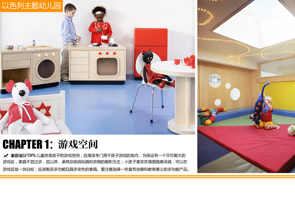 1、幼兒園的活動室可愛而多變化,具備光線充足、空氣流通、色調柔和三大條件。空間以藍色、白色、紅色及天然木質原色為主,玩具設施以啟發性大、危險性小為宜。這個活動室以模擬家具為特色,玩具冰箱、玩具烤爐,甚至是玩具醫護床,都是純手工的木雕作品,它們經過涂漆、貼膜的處理,呈現出家的感覺。